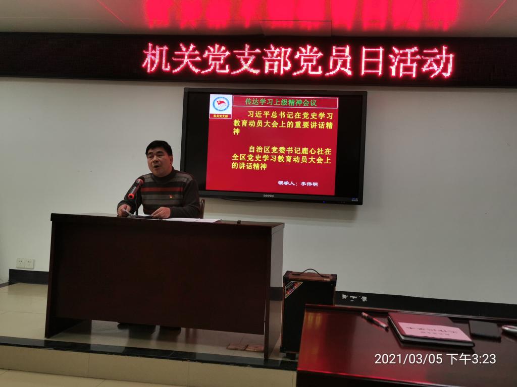 3月5日是黨員活動日,機關黨支部舉行黨員大會,傳達學習中央、自治區、梧州市有關會議精神,部署近期工作。黨支部副書記李偉明主持會議并帶領學習。