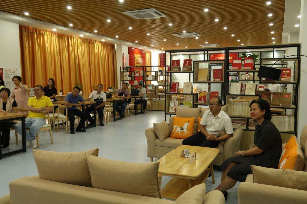 在“紅灣”主題閱讀體驗區聽取情況彙報。