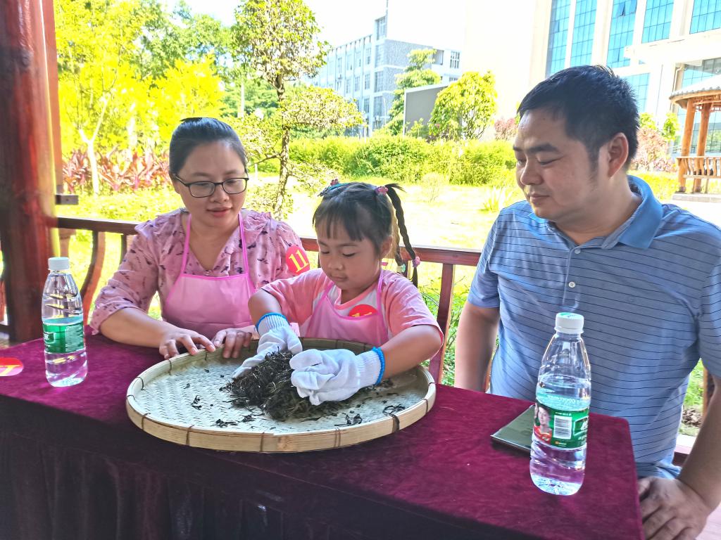 在“親子搓茶”活動現場,孩子們穿上圍裙,戴上隔熱手套,和爸爸媽媽們一起體驗從鮮茶葉變成幹茶葉的制作過程。