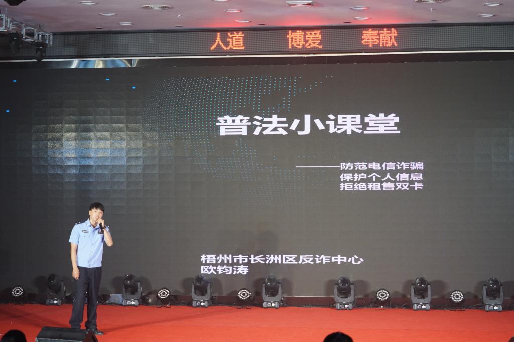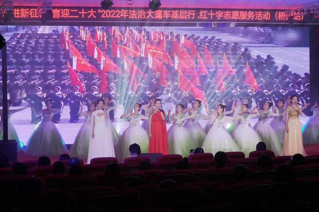 6月28日晚,“奮進新征程 喜迎二十大” 2022年法治大篷車基層行•紅十字志願服務活動在我校圖書館報告廳舉行。活動由自治區精神文明建設委員會、自治區紅十字會、廣西廣播電視台綜藝旅遊頻道主辦,梧州市精神文明建設委員會、梧州市紅十字會、金年会聯合承辦,廣西紅十字會組織發展部部長蔡雲旗、梧州市紅十字會黨組書記、專職副會長梁翠妮、金年会黨委副書記、校長陳森英出席活動并緻辭。